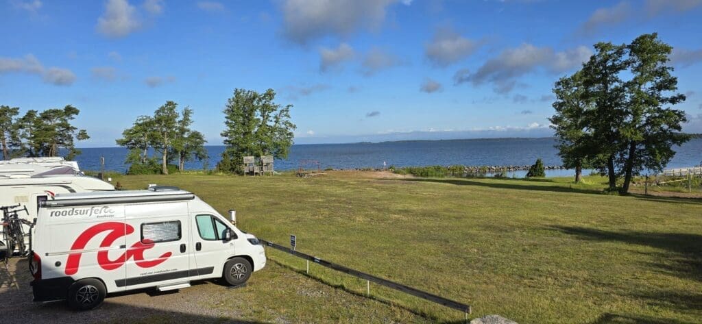 Just south of Kristinehamn is the summer home of the Equmenia Church. It used to be the harbour master's home, but today it serves as a parking lot and chapel. The location is beautiful as the site is on a headland with water on two sides. There are 13 pitches but if you ask nicely, you can also use their "emergency pitches" which are not marked. The practicalities are handled on site by the "caravan park manager" and cannot be booked in advance.