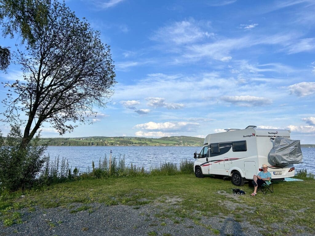 Just south of Gjøvik we found the caravan park at Furuseth farm. It's a really scary gravel road down to the farm and the beautiful caravan park by Lake Mjøsa. Fortunately, the road is not very busy, but is only shared by a couple of houses so the risk of meeting is probably quite small. The caravan park has fourteen pitches, about half of which have electricity, which makes it a very quiet and scenic place. Perfect for serving a bottle of bubbly by the beach and enjoying the sunset.