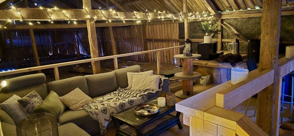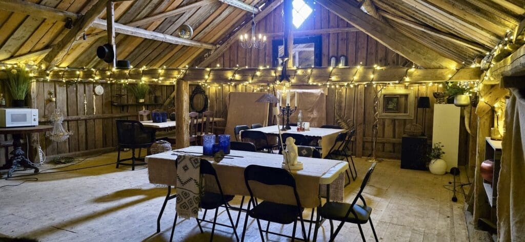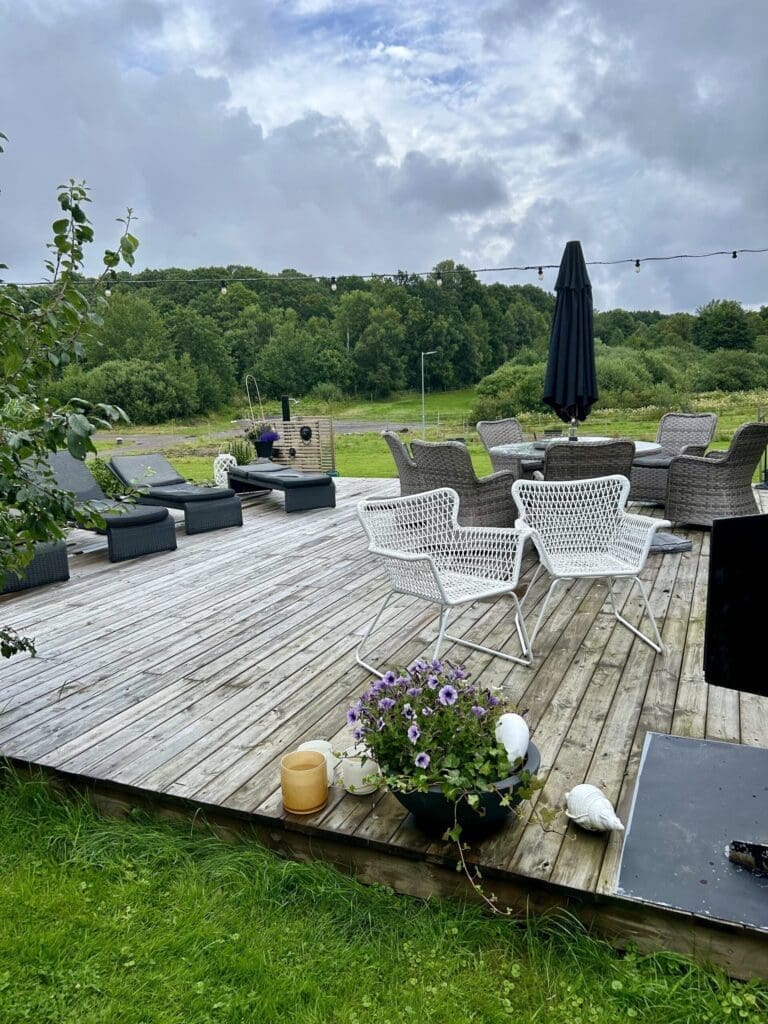 In summer 2024 the bathrooms are being renovated so there are no toilets but there is an outdoor shower. It's right next to the wooden deck where you can sunbathe in the deck chairs or light a fire depending on the weather. If the weather is really bad, you can instead hang out indoors on top of the stables where there is a kitchen, dining room and sofa corner with TV.