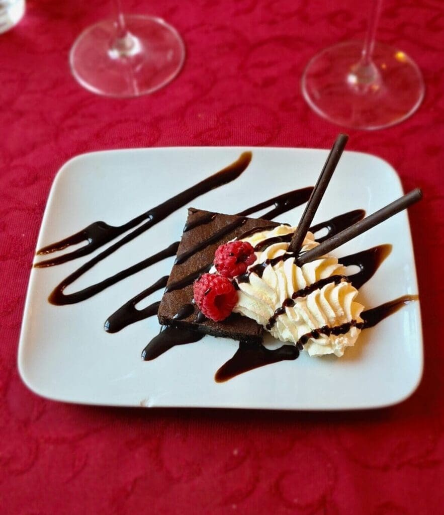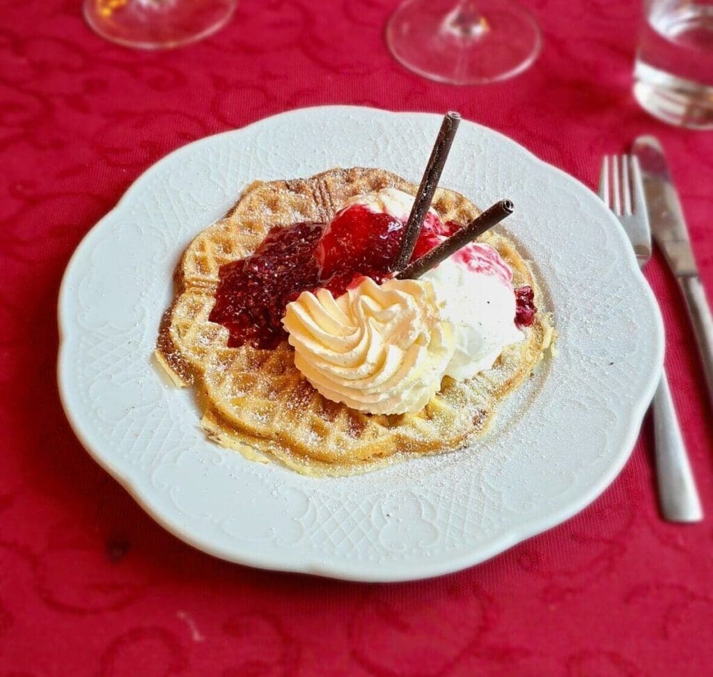 I almost always choose beef fillet when it is on the menu, chose to try their signature dish Charlottenlundsbiffen with oven-roasted potatoes, red wine sauce and béarnaise sauce. A dish that is actually of the simpler kind, but so good! For dessert, Henrik chose another of their favourite dishes, the Charlottenlund waffle with bourbon ice cream, cream, berries and homemade raspberry jam. Considering how quickly it went down, I think it was good. My brownie did not go off for chops either. 🙂