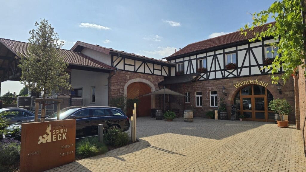 This site is located in the centre of the small village of Sankt Martin, between Mannheim and Karlsruhe, near the French border. It is run by Schreieck, one of the village's many winegrowers, and offers views of the vineyards on one side and the hotel and winery on the other.